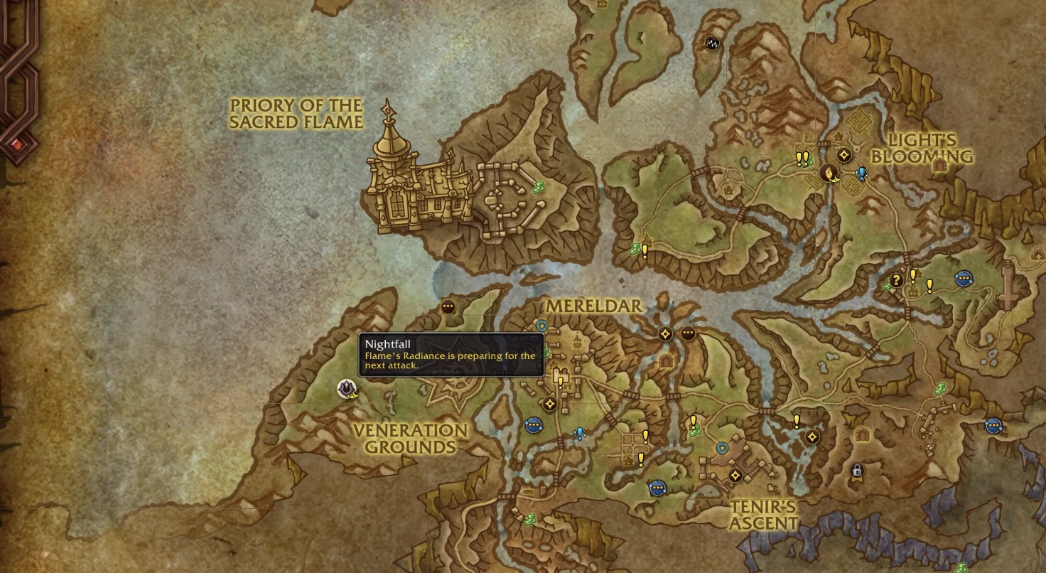 Nightfall is a new world event that happens every hour in Hallowfall. In this scenario, players will join tasks forces with the new faction, Flame's Radiance, to help defend the Arathi against the Sureki.