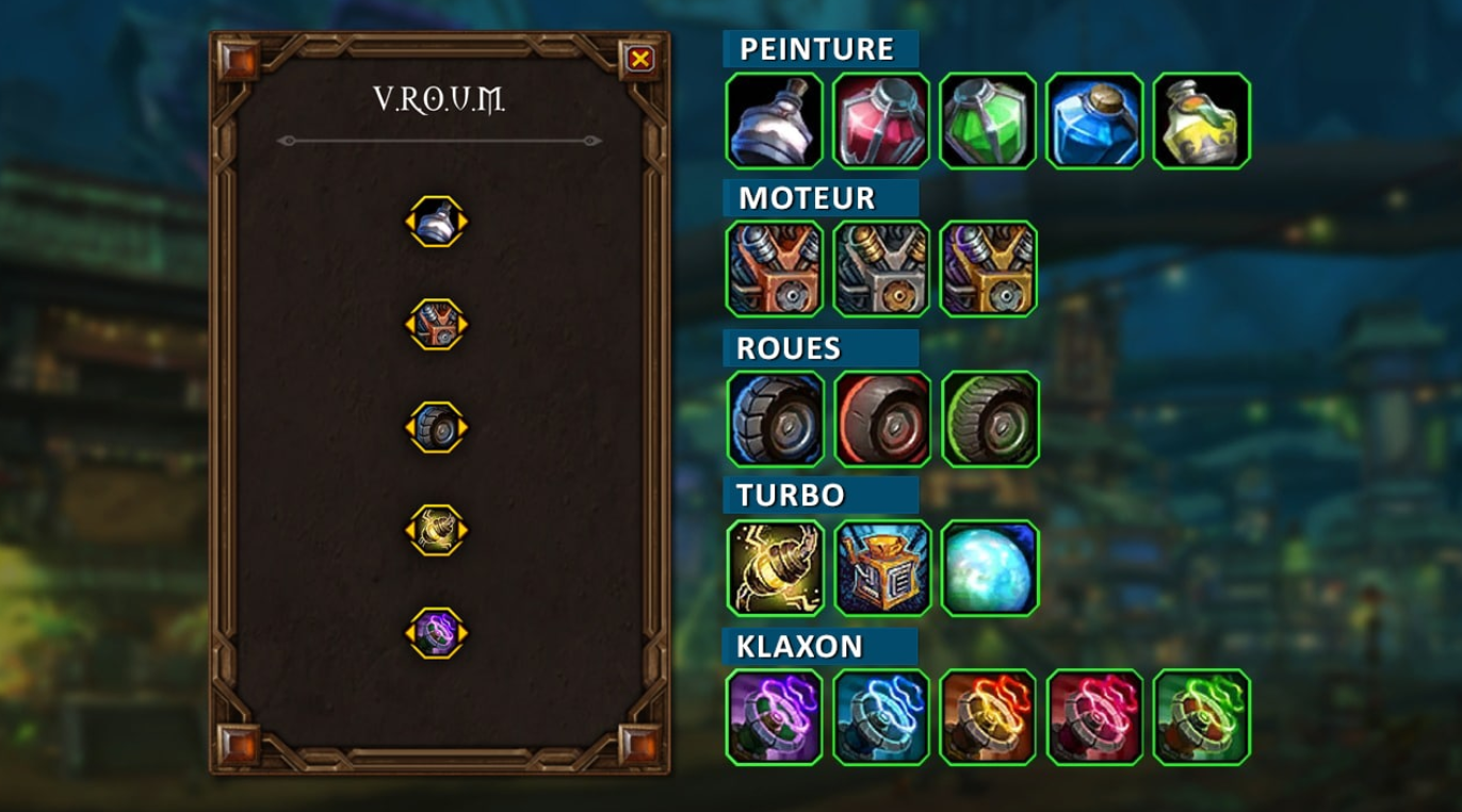 Brutor permet d'accéder au V.R.O.U.M. pour personnaliser les caractéristiques du véhicule au garage entre 5 catégories :