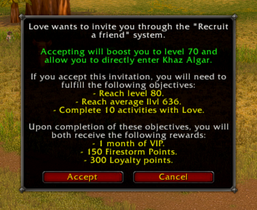 Vous devez savoir que vous aurez la possibilité d'utiliser le système de parrainage une fois par mois avec un de vos amis sous la condition que celui-ci n'ait pas déjà un personnage de niveau 59 ou supérieur sur son compte.
